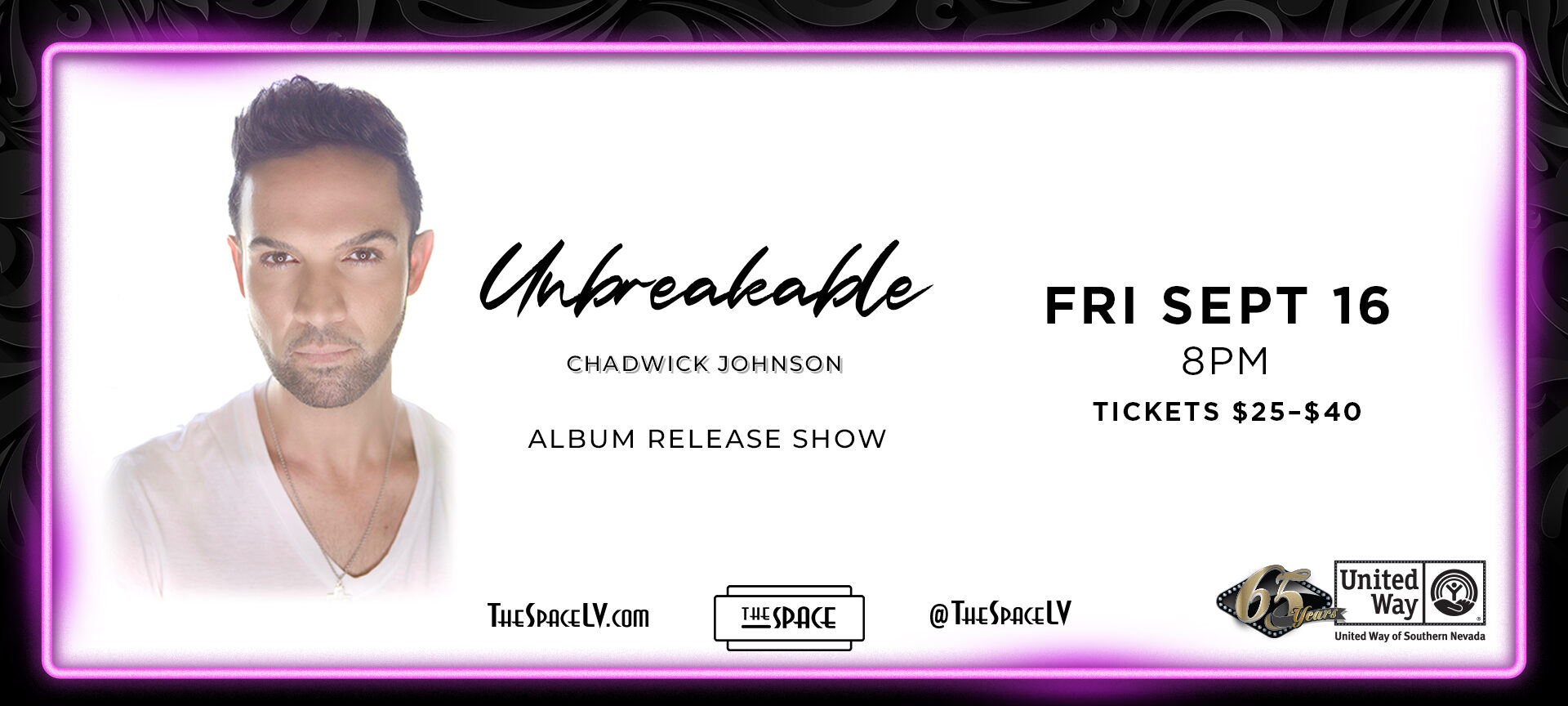 Tickets for the UNBREAKABLE album release show in Vegas range from $25 to $40. Start time is 8 pm. THE SPACE is located at 3460 Cavaretta Court, a few blocks from the Strip. Information and tickets for all four shows can be obtained at https://chadwickjohnson.