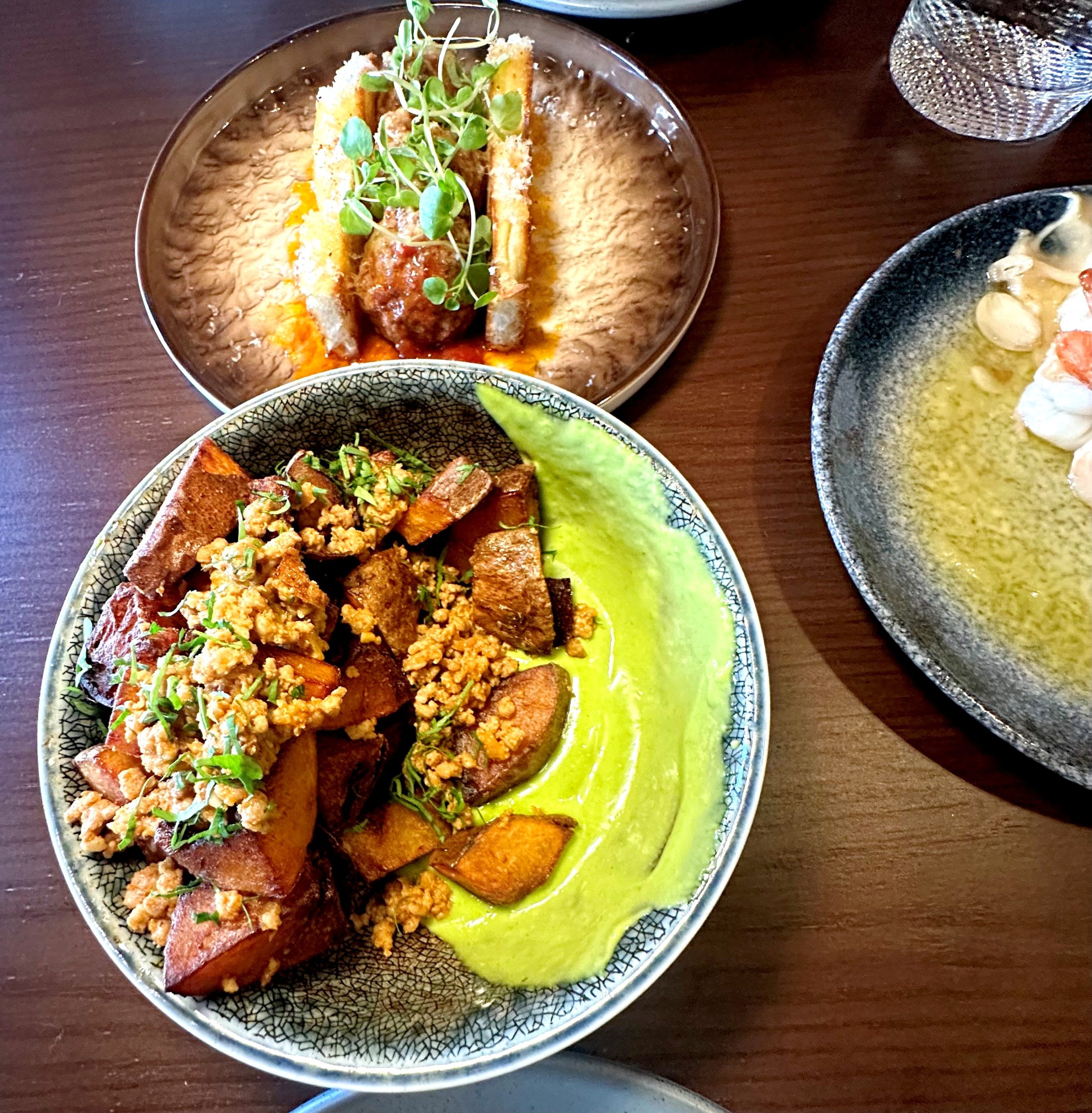 High-quality ingredients and bold taste sensations rule the day here. This was reflected in everything we ate: the patatas bravas, wagyu meatballs, shrimp with garlic oil, croquetas with ham, and a main plate of cod with Basque salsa verde, lemon, and oil. A standout pintxo consisted of egg and ham, with garlic oil and onion sprouts. No way could we leave without diving into the seductively creamy Basque cheesecake.
